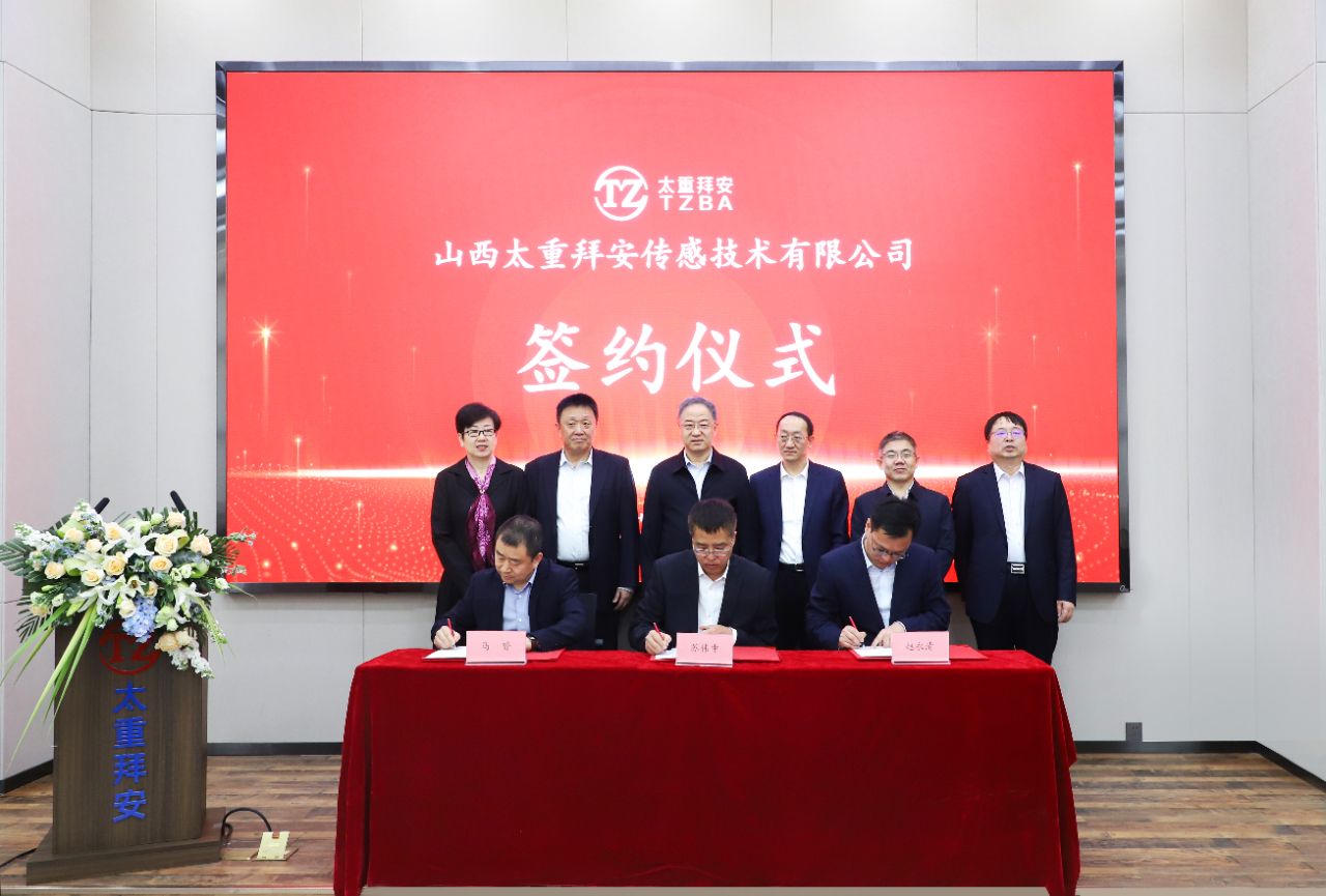 会上,三方股东代表进行合作签约,韩珍堂与相关领导共同见证。省投促局党组成员、副局长刘伟与山西太重拜安传感技术有限公司董事长程东生共同为公司揭牌。