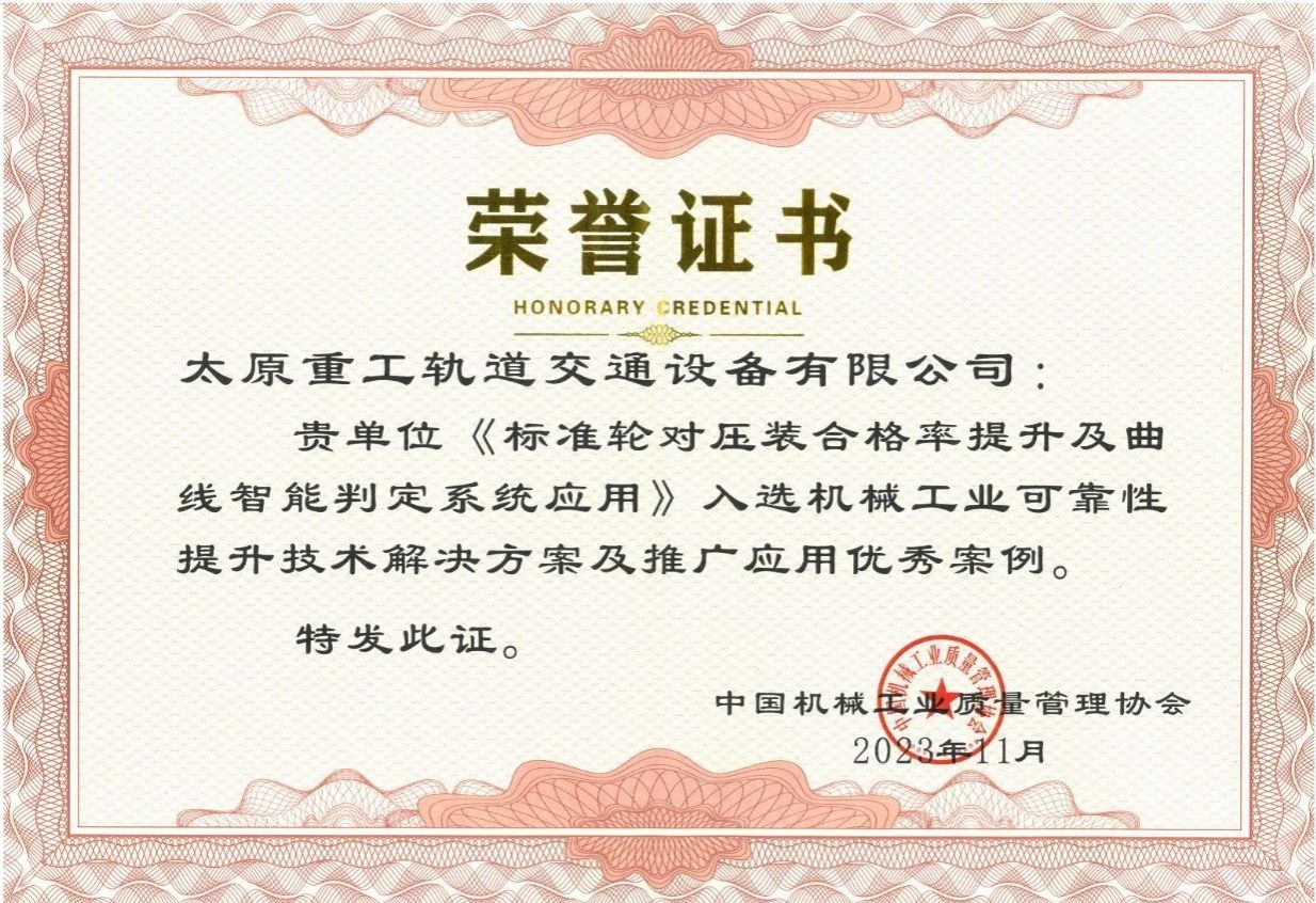 近日,在第八届全国机械工业可靠性技术应用交流大会上,太重轨道公司《标准轮对压装合格率提升及曲线智能判定系统应用》项目荣获机械工业可靠性提升技术解决方案及推广应用优秀案例,是山西省唯一入选该奖项的企业。