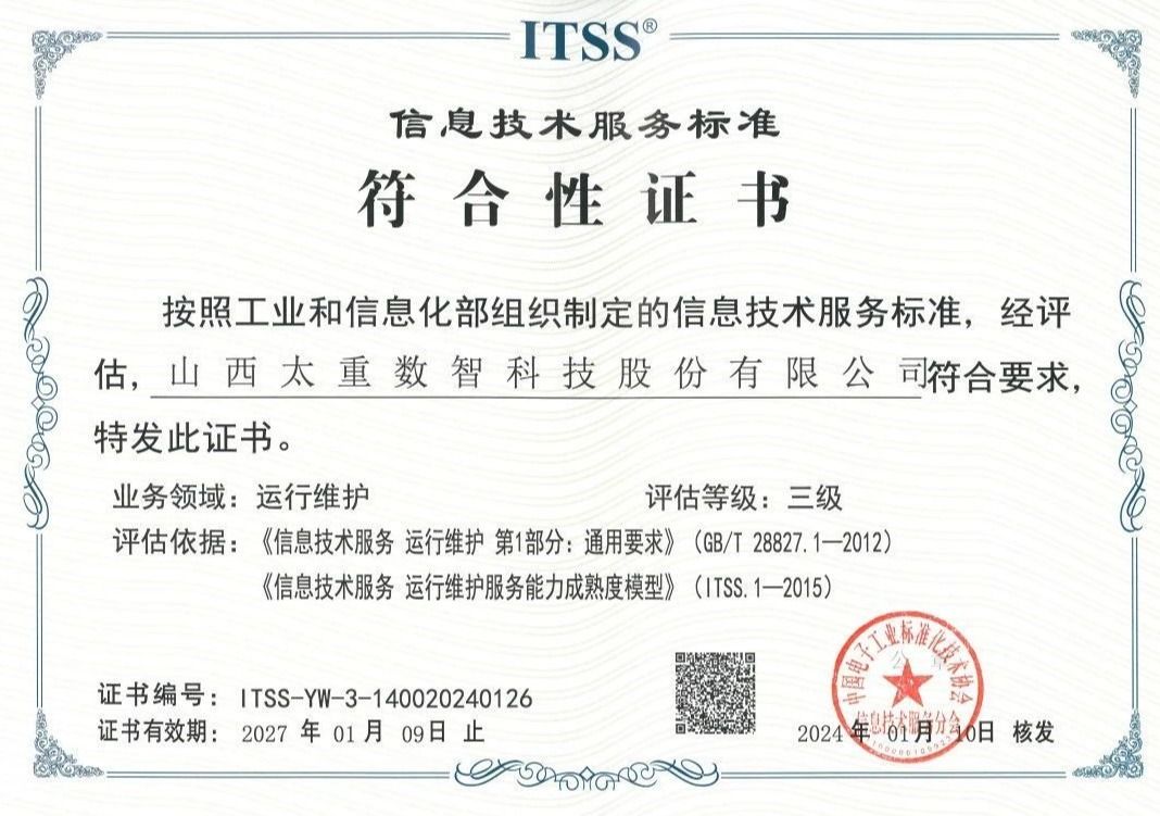 经过中国电子工业标准化技术协会信息技术服务分会的评估,近日,太重数智公司顺利通过ITSS信息技术服务标准符合性评估三级认证(运维服务),获得《信息技术服务运行维护标准符合性认证证书》。这标志着数智公司在运维服务能力和服务标准化体系建设方面,获得了国家级资质认证,对于向内保障太重数实融合升级、向外开拓数智服务市场,都具有重要意义。