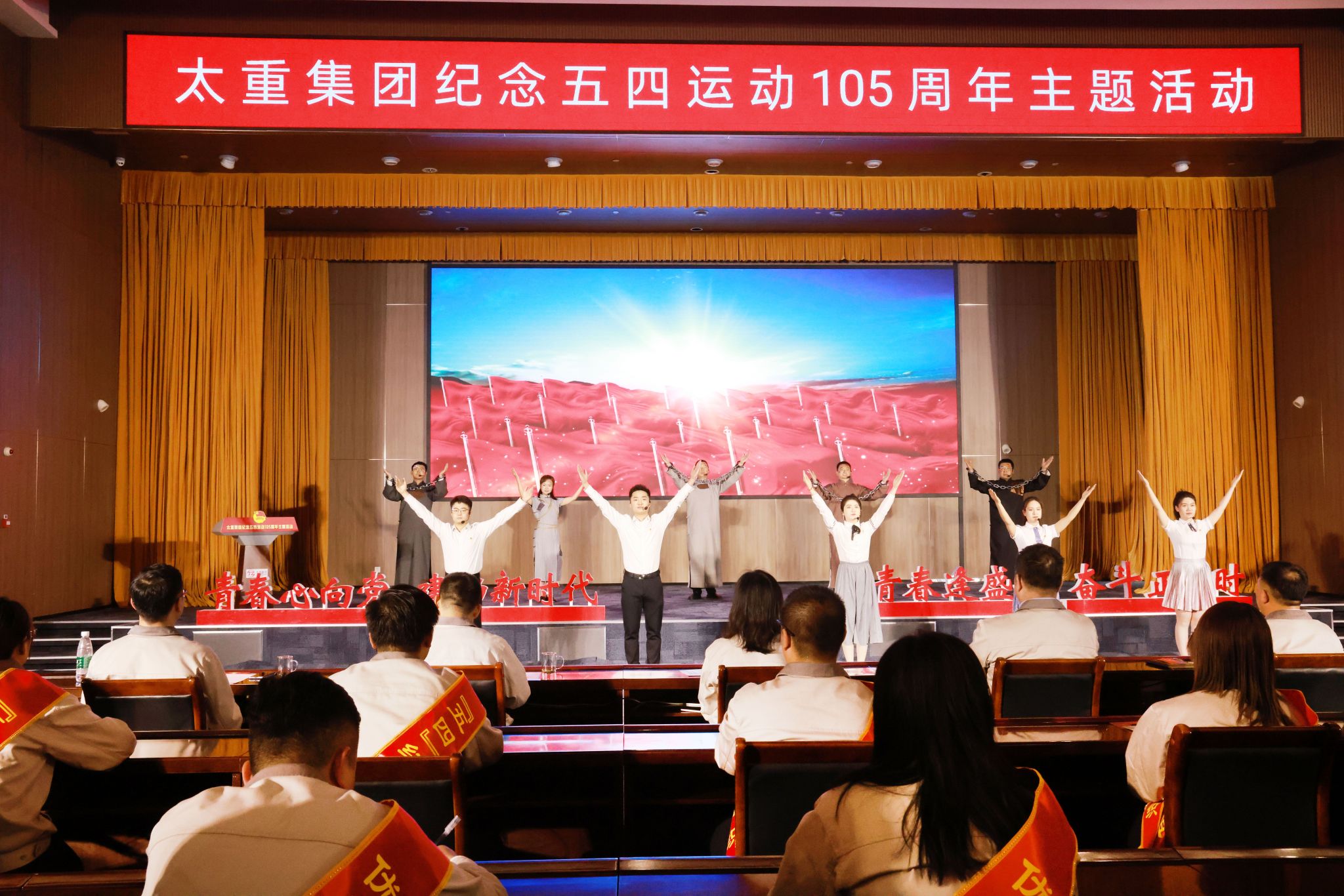 活动现场气氛热烈,处处洋溢着属于青年人的朝气蓬勃和意气风发,一台生动的情景剧《时空对话》将所有人拉回了那段激情燃烧的岁月。音韵和谐、朗朗上口的音乐快板《青春太重》,形象展示了太重青年踔厉奋发、勇毅前行的拼搏故事。舞蹈《五四、向前》突破语言文字的羁绊,以灵动的舞姿感受青春的力量,重温党带领青年运动的光辉历程。青年技能绝活秀环节,工程机械公司挖掘机驾驶员在线演绎用挖掘机铲斗点燃打火机,能源中心水、电、气输配工现场盲背智能高端装备产业园区水、电、气管网管线相关情况,笃定的眼神、自信的神态,无不展现出太重职工的铿锵风采。在全国青年岗位能手标兵宋志伟的领誓下,全体人员重温入团誓词、感悟初心使命,以此号召广大团员青年弘扬五四精神,以先进为榜样,在制造强国、工业振兴的赛道上奋力奔跑、挥洒汗水。