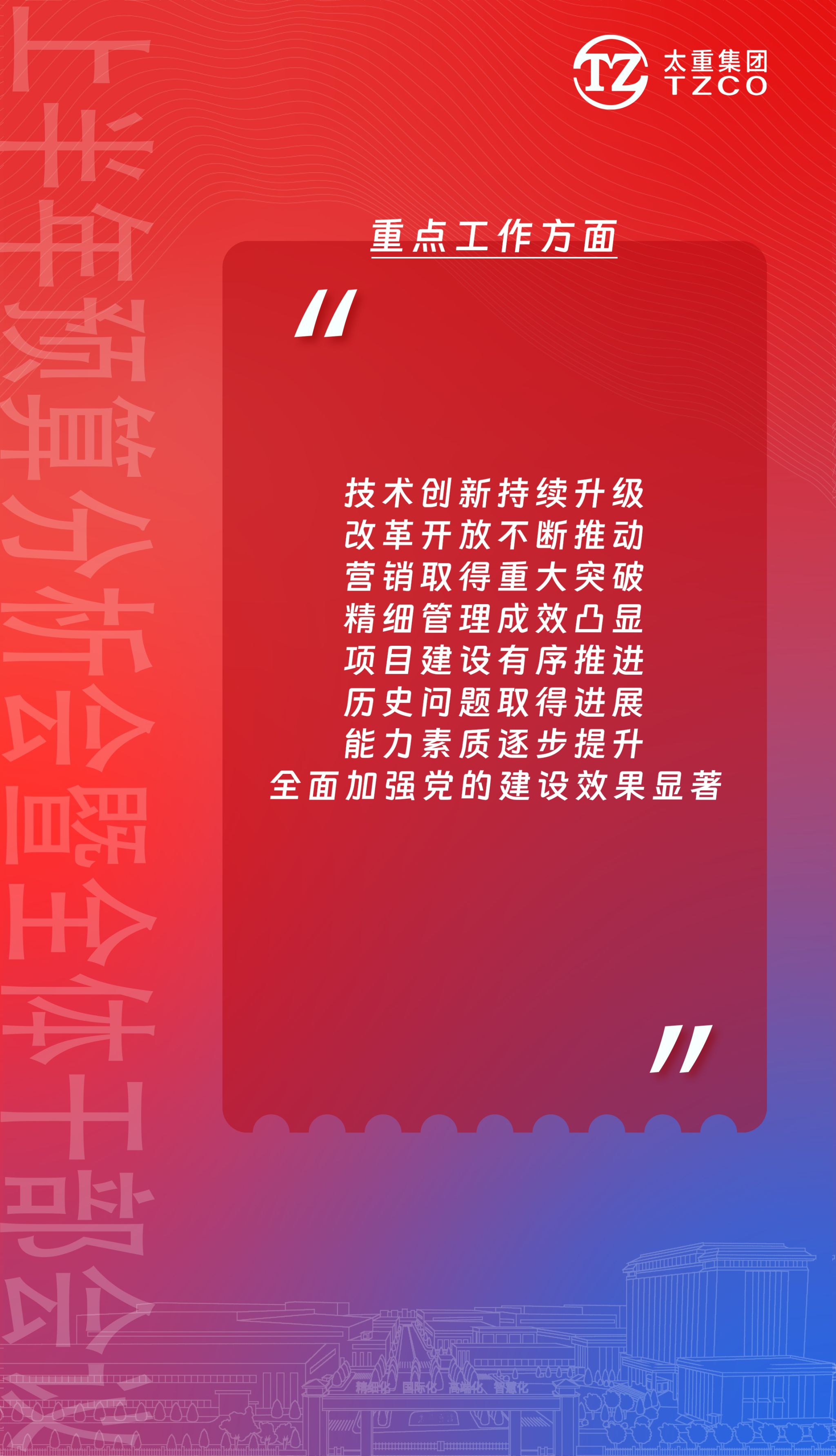 期待不容辜负,使命不容懈怠!让我们上下同欲、团结拼搏,铆足干劲加油干,积势蓄能攀新高,共同将太重建设成为跨越时空、基业长青、朝气蓬勃的百年老店!