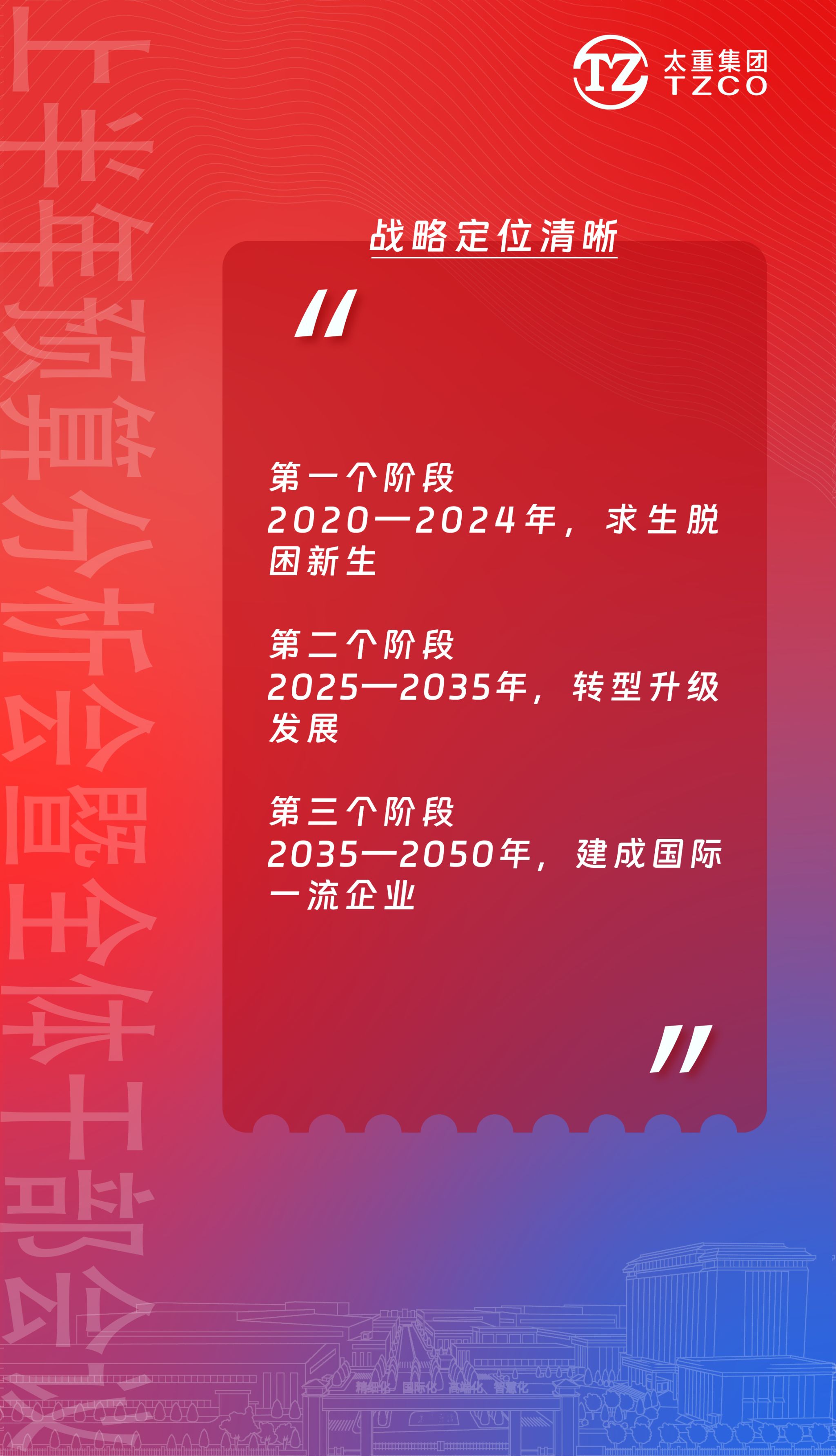 2024年7月18日,中国共产党第二十届中央委员会第三次全体会议通过《中共中央关于进一步全面深化改革 推进中国式现代化的决定》,提出“到二〇二九年中华人民共和国成立八十周年时,完成本决定提出的改革任务”。二〇三〇年,太重建厂八十周年,随着国资国企改革的持续深化,太重必将完成转型升级。