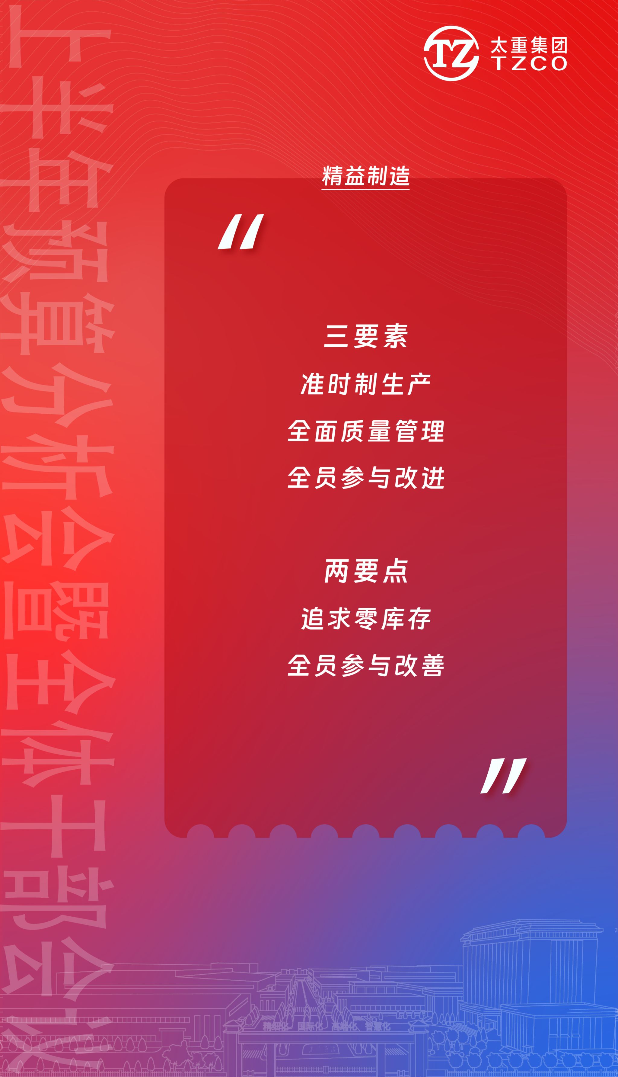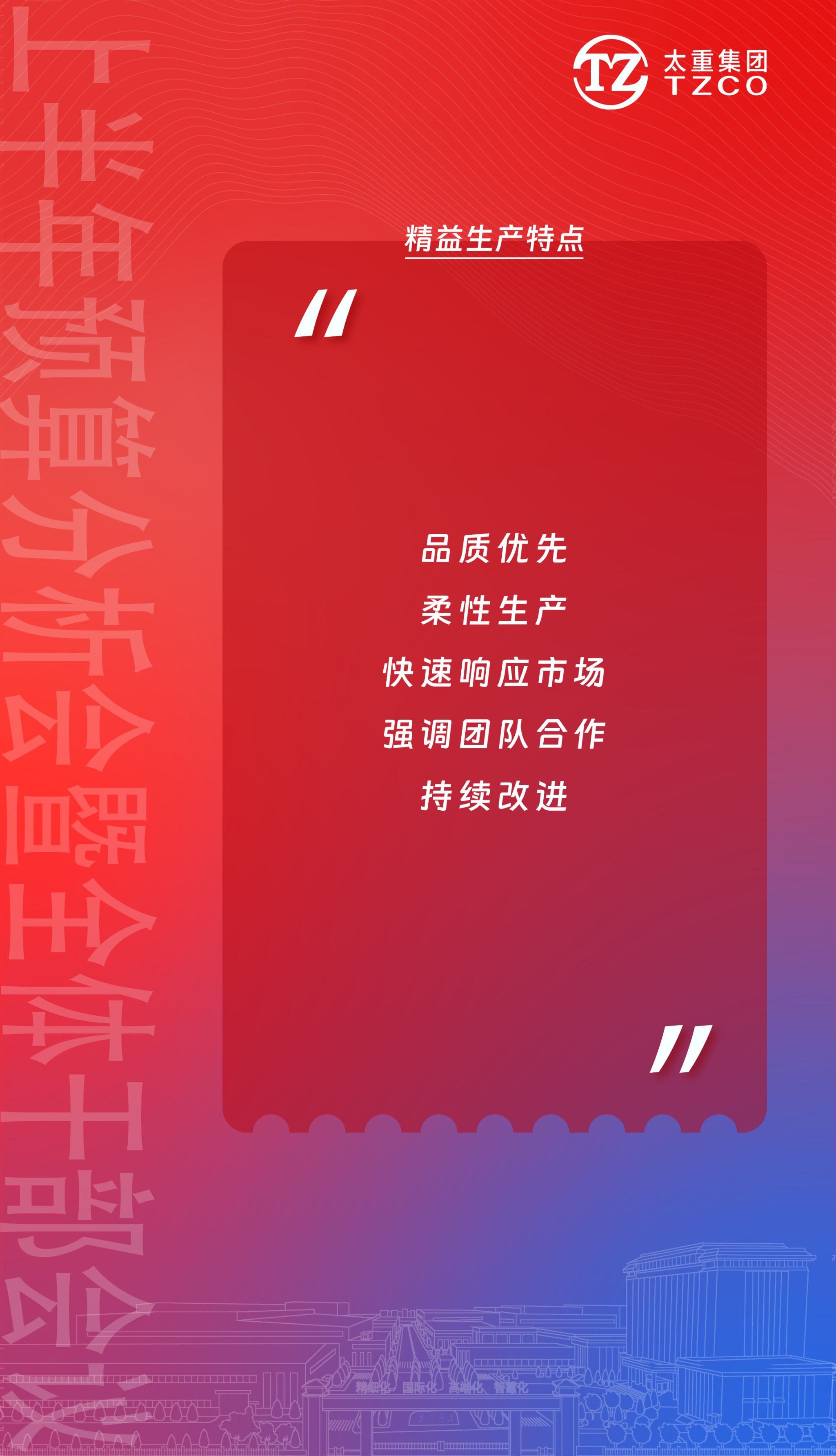 精益制造!制造精品!其理念就是为用户提供更多的产品价值,以“精益制造”理念贯穿公司高质量高速度发展之路,是所有太重人的必修课。