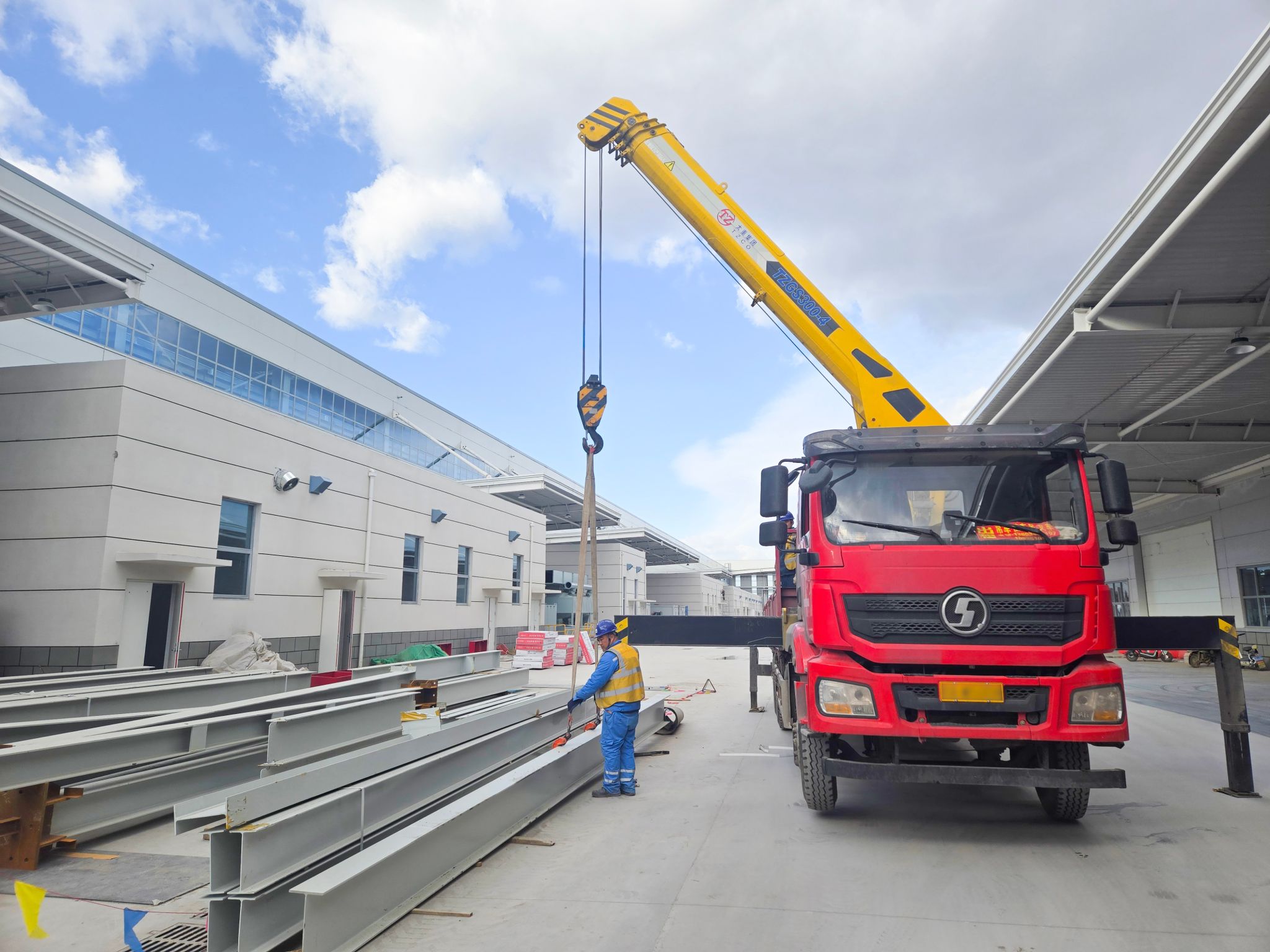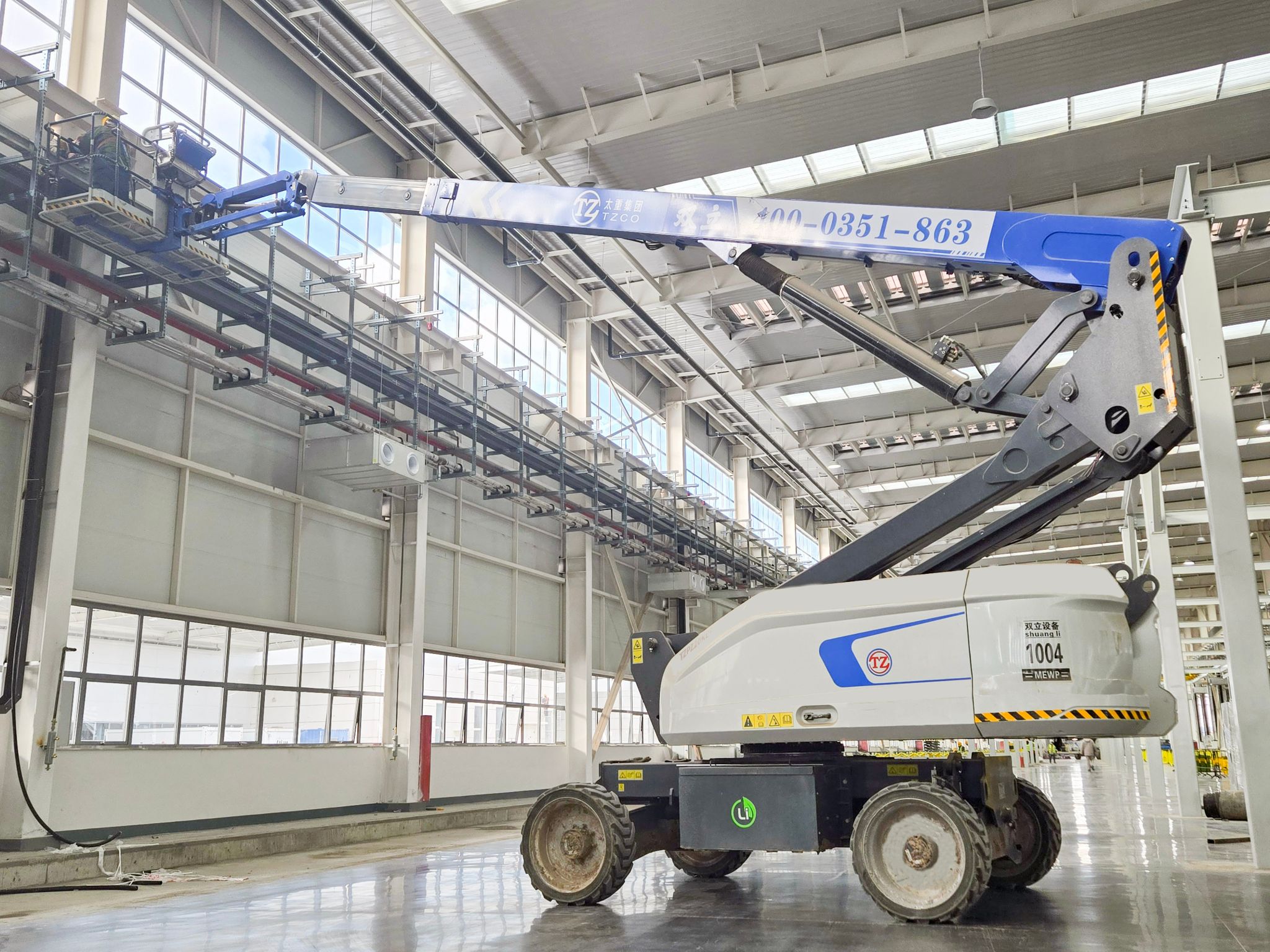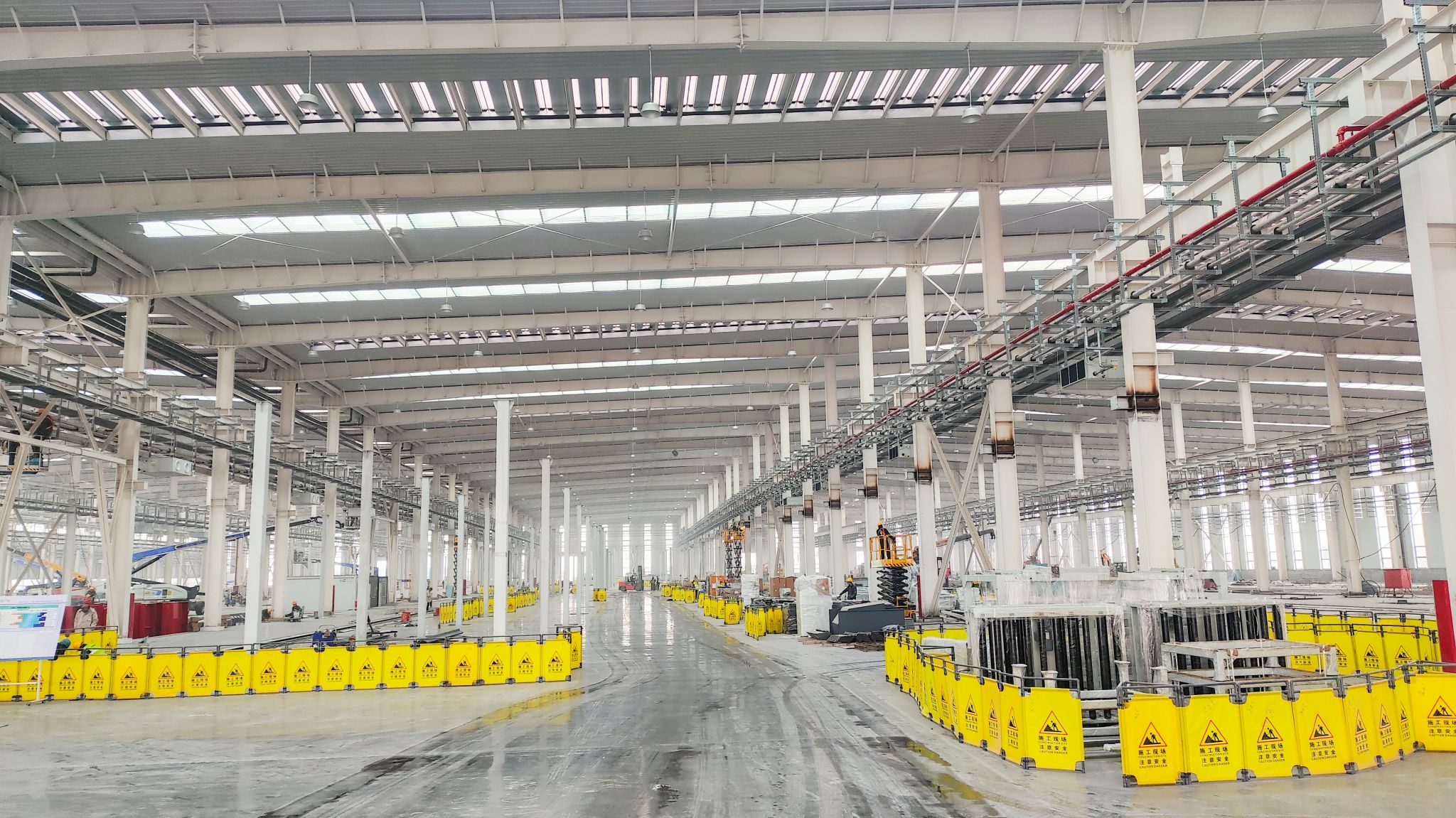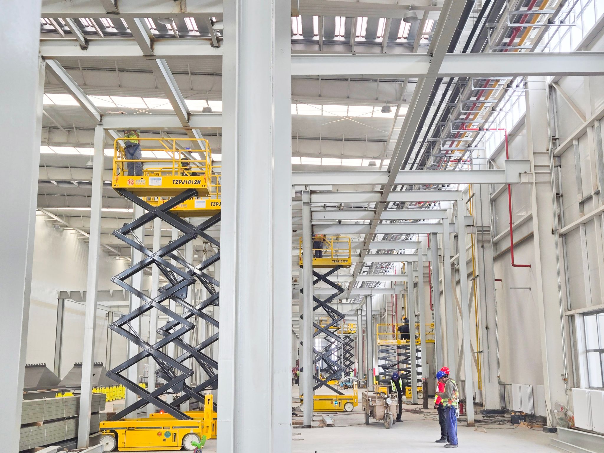高端产线亮点纷呈,太重装备在其中忙得“不亦乐乎”。联合厂房内,太重研制的高空作业平台随处可见,随车起重机更是以其灵活的特性在厂房完善中发挥着关键作用。一位现场施工人员感慨道:“太重直臂车、剪叉车成为我们的得力帮手,用自己的一流产品,造自己的一流园区,相信园区建成之后,太重工程起重机产品的性能只会更好!”