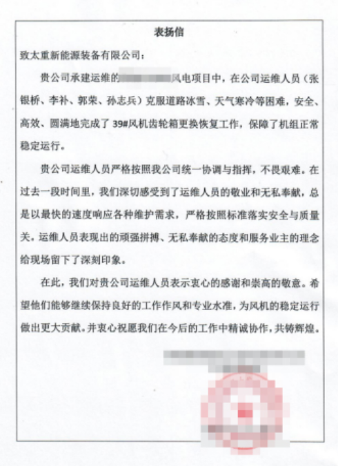 这封感谢信,映照出太重运维团队坚韧付出的炽热画面。“任务就是命令,保证供电需求,一刻耽误不得。”运维团队负责人张银桥的话语掷地有声,道出了团队在极端环境下的坚守与担当。“坚守”是运维人员在-20℃的天气中,为了排查风机故障隐患,轮流值守在各个关键点位。“敬业”是运维人员在100米高空悬吊作业7小时后,用冻僵的手指完成0.02毫米齿轮间隙校准。“协作”是运维人员面对突发故障,力出一孔,协同调配物资,迅速制定方案,大家紧密配合,高效协作,仅5天完成维护工作。一封感谢信,是认可,更是激励。作为山西风电装备产业链“链主”企业,太重在风电领域有着强大的实力和优势。未来,公司将持续提升服务质量、创新服务模式,以优质服务全力打造高品质标杆项目,与合作伙伴携手前行,为推动新能源产业高质量发展贡献力量。