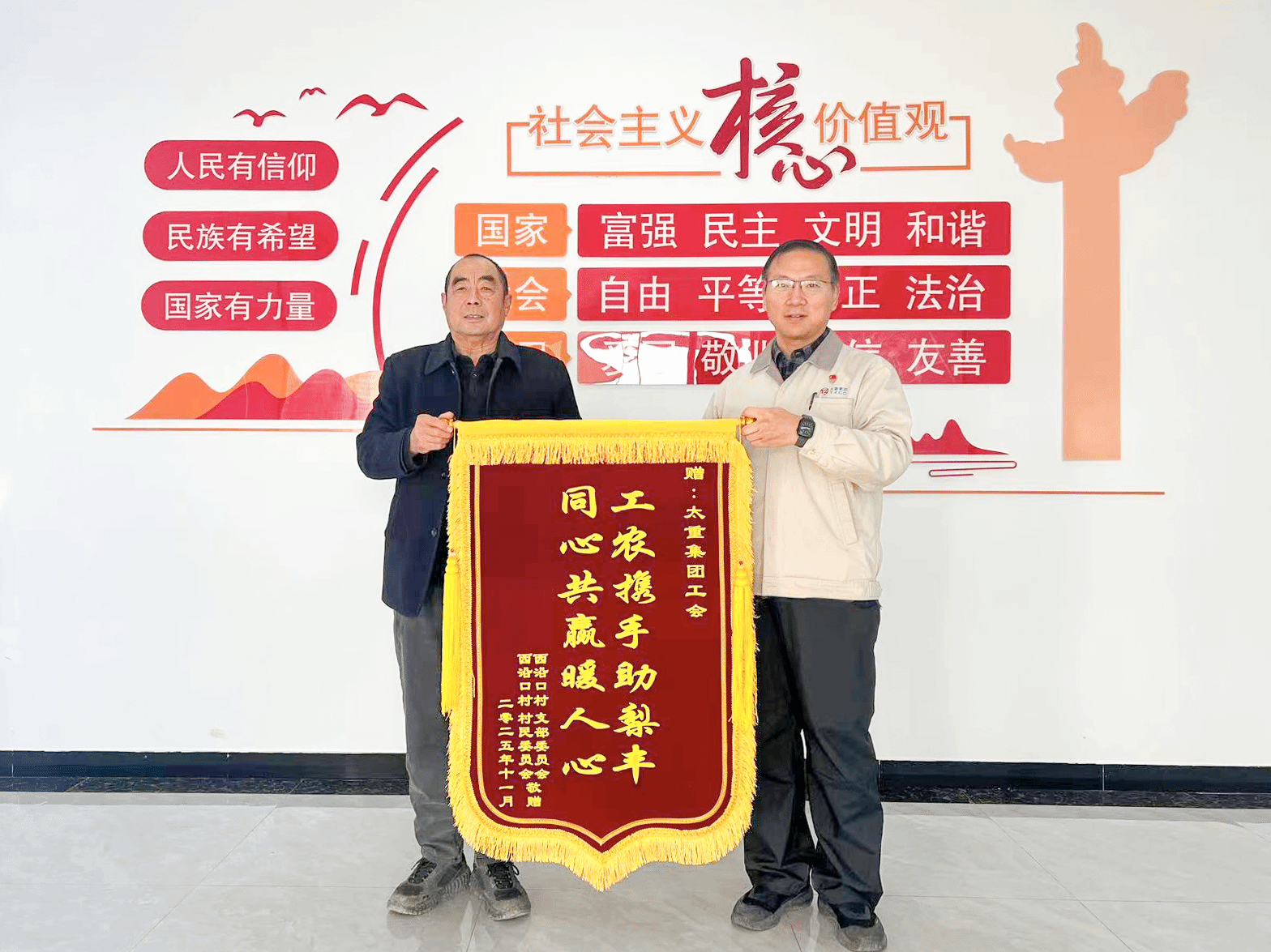 “多亏了你们,从教技术、建冷库到帮销售,咱们玉露香梨的每一步都离不开工作队的帮扶!”近日,太重驻村工作队收到西沿口村种植户王计元送来的锦旗,“工农携手助梨丰 同心共赢暖人心”的字样满含深情,印证的是帮扶工作的扎实成效,更是企业与乡村心手相牵的温暖情谊。