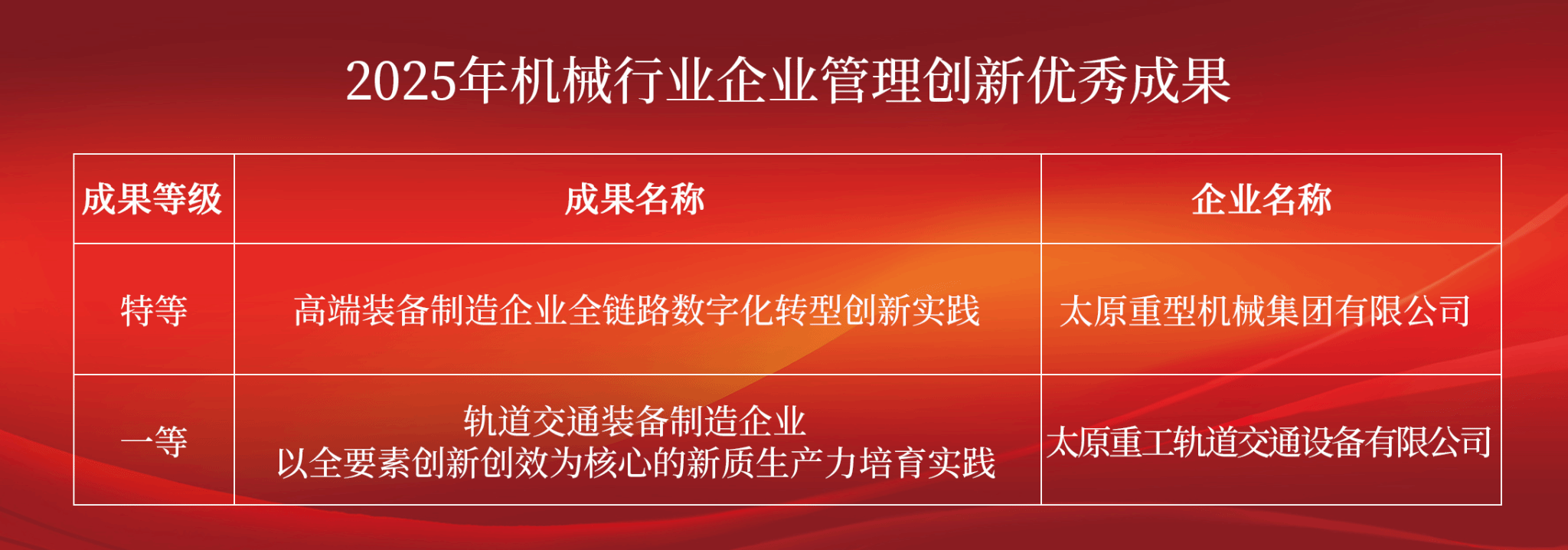 改革之路,创新筑基!近日,中国机械行业企业管理协会正式发布2025年机械行业企业管理创新优秀成果名单,太重两项成果荣耀上榜,分别获得特等奖和一等奖。