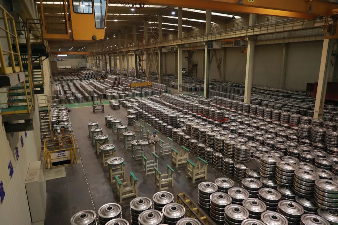 这是一条年产车轮40万片的生产线,也是目前国内自动化程度最高的车轮生产线。从这里生产出来的车轮,可用于高铁、地铁、大型客车等。