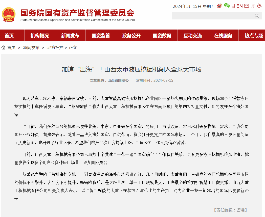 作为装备制造业的领军企业,太重被格外关注,被寄予厚望。近日,国务院国有资产监督管理委员会官网刊登了《加速“出海”!山西太重液压挖掘机闯入全球大市场》;山西新闻联播也在《推动高质量发展 深化全方位转型》栏目中对太重进行深入报道。