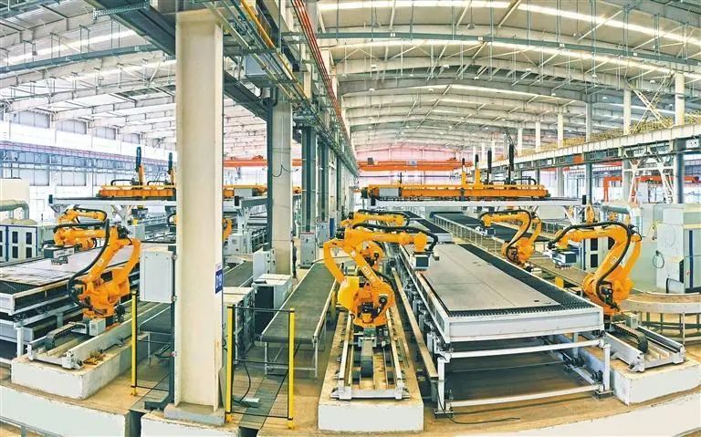 在太重智能高端装备产业园区内的智能加工配送中心下料车间,分拣手臂机器人正在工作。王泽龙摄(中经视觉)