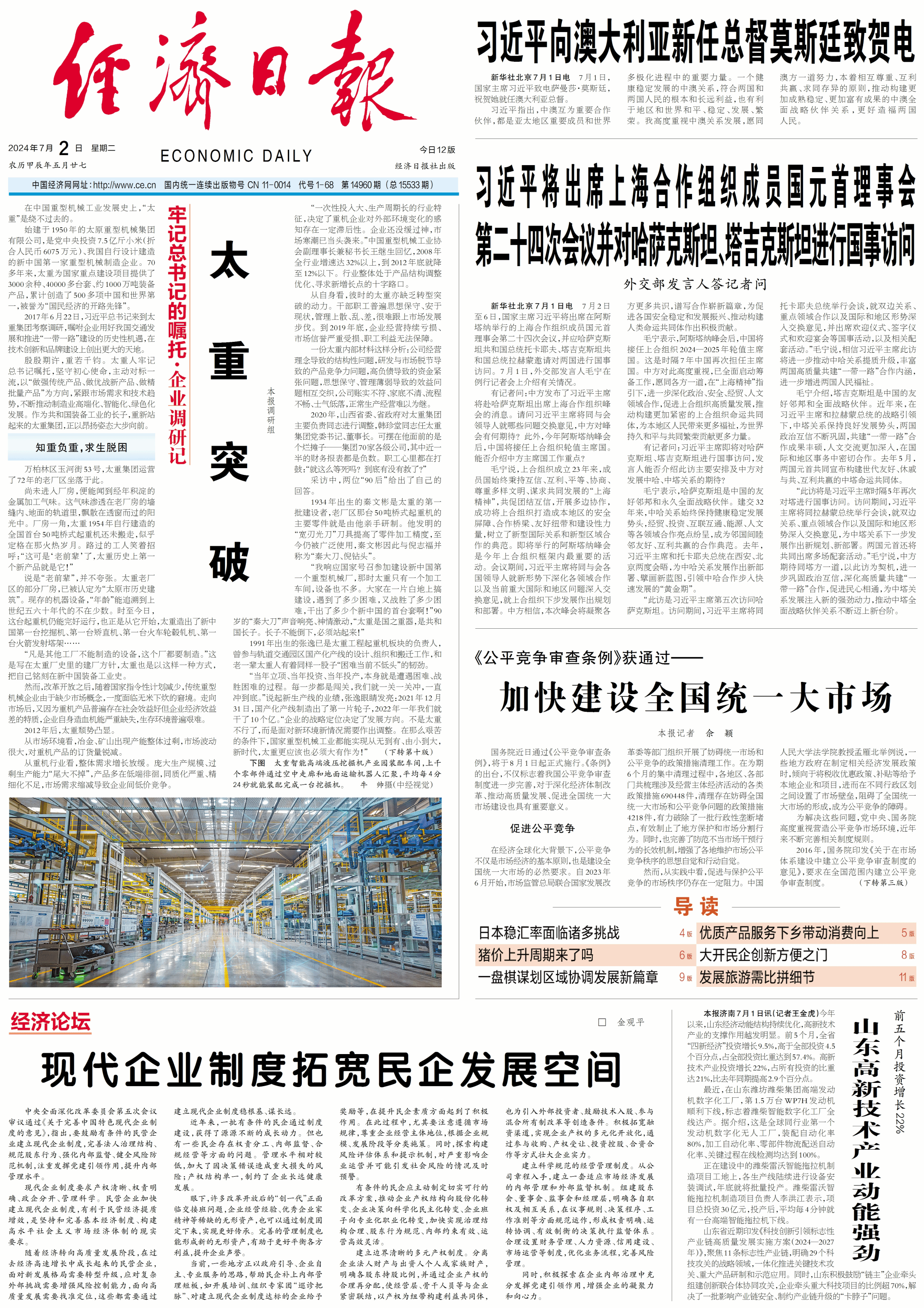 殷殷期许,重若千钧。太重人牢记总书记嘱托,坚守初心使命,主动对标一流,以“做强传统产品、做优战新产品、做精批量产品”为方向,紧跟市场需求和技术趋势,不断推动制造业高端化、智能化、绿色化发展。作为共和国装备工业的长子,重新站起来的太重集团,正以昂扬姿态大步向前。