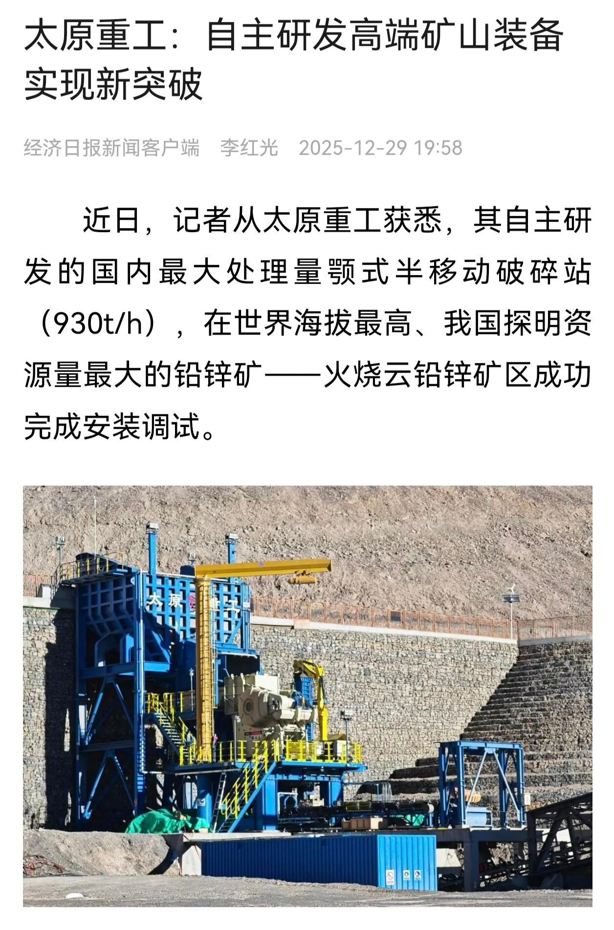 近日,经济日报刊发《太原重工:自主研发高端矿山装备实现新突破》文章,聚焦太重自主研发制造的国内最大930t/h颚式半移动破碎站。